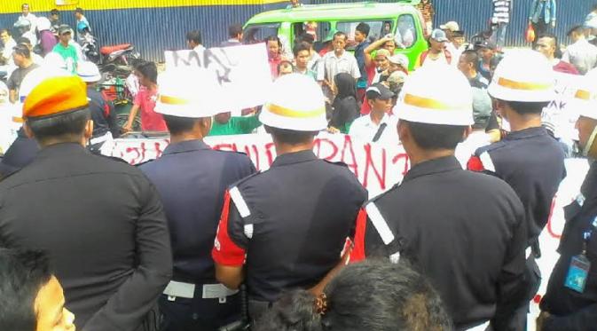 Dalam aksinya, massa menuntut agar PT KAI membuka kembali pintu masuk stasiun yang berada di Jalan Nyi Raja Permas, yang sejak hari ini mulai ditutup.