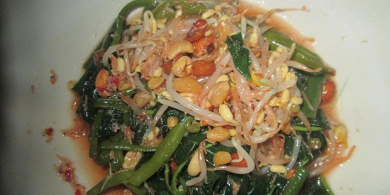 “Ciri khasnya serombotan sih, sayurnya kangkung, kacang panjang, tauge dan pare. Terus ditaburi kacang mentik dan saur (parutan kelapa yang disangrai). Terus disiram dengan bumbunya atau sambalnya yang pedas,” katanya.