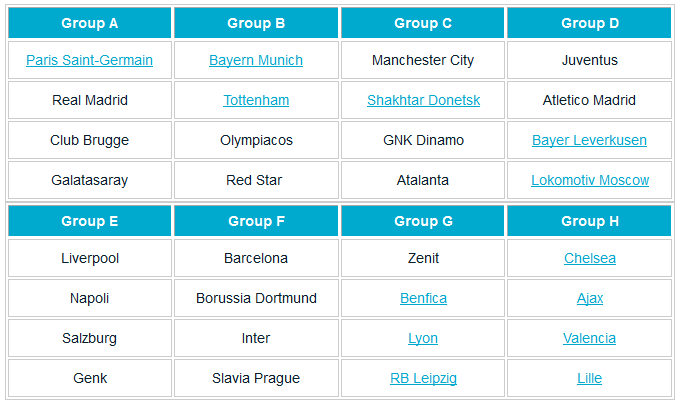 Sementara itu, PSG dan Real Madrid menghuni grup A bersama Galatasaray dan Club Brugge. Kemudian debutan asal Italia, Atalanta, harus langsung mendapat ujian besar dengan bertemu Manchester City.