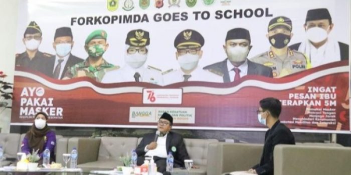 CIBINONG, jabarmedia.com = Pemerintah Kabupaten (Pemkab) Bogor lakukan kegiatan Forum Koordinasi Pimpinan Daerah (Forkopimda) Goes To School untuk mengedukasi para siswa di Kabupaten Bogor agar turut serta melakukan vaksinasi Covid-19 dan ajak pelajar sadar sejarah secara virtual di Aula Nusantara Kantor Bakesbangpol Kabupaten Bogor, Kamis (9/9).