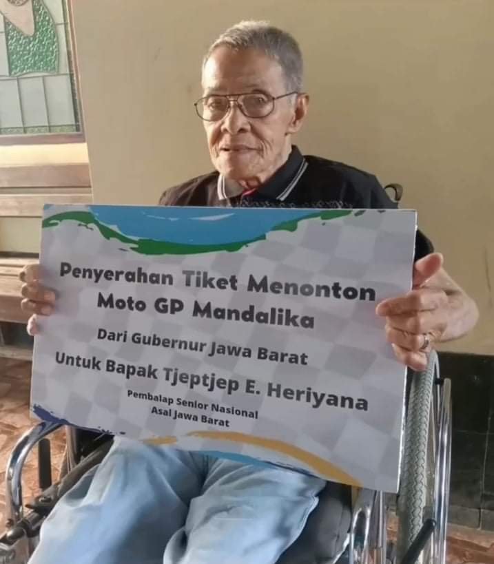 Senyum Tjetjep Heriyana semakin merekah setelah mendapat tiket menonton MotoGP secara langsung di Sirkuit Mandalika, Lombok, Nusa Tenggara Barat, dari Gubernur Jawa Barat Ridwan Kamil.