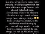 “Saat itu saya husnudzon ke masnya. Saya percaya, tanpa mikir panjang langsung transfer karena saya mikir, sesuatu perbuatan baik akan dibalas baik juga. Tapi setelah transfer, pesanan makanan saya malah dibatalkan dan benar saja saya ditipu,” sambung Yeni yang merasa kecewa karena ketulusannya dimanfaat orang tak bertanggung jawab.