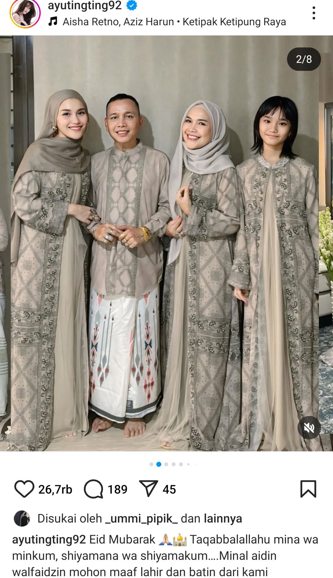 Dalam postingan tersebut, Ayu menampilkan sejumlah gambar dari perayaannya saat Lebaran. Gambar pertama dicapture setelah Ayu bersama dengan keluarganya menjalankan sholat Idul Fitri.
