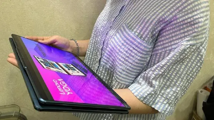 Gaya notebook dari Lenovo Yoga Book 9i menjadikannya tampak mirip dengan laptop standar. Akan tetapi, kedua layarnya berukuran OLED 2.8K yang menjadi pusat perhatian akan menghasilkan gambar berkualitas tinggi dengan dukungan grafis Intel Iris Xe. Mode ini sangat sesuai digunakan saat bekerja secara intensif. Pemakaian bisa ditingkatkan melalui penggunaan papan ketik digital yang akan muncul di layar bawah untuk melakukan semua jenis input.