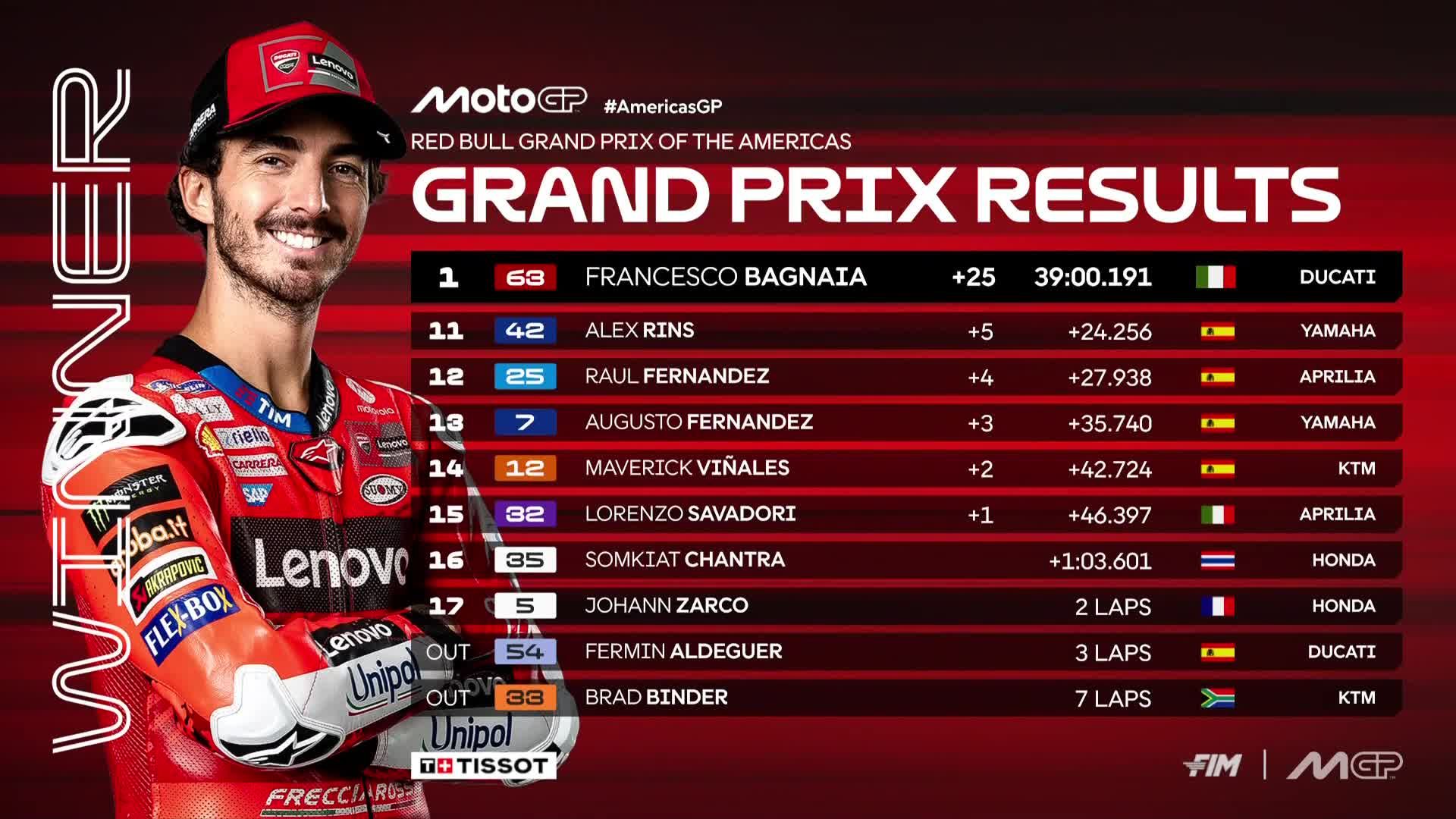 Perhatikan hasil lomba MotoGP di Amerika Serikat tahun 2025 berikut ini: