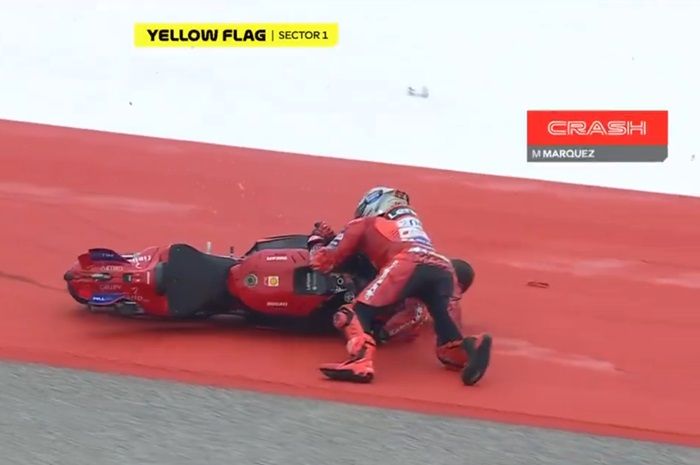 Marc Marquez mengalami nasib sial jatuh di tikungan ke empat, tetapi berhasil bangkit setelah turun ke posisi 18 dan ketinggalan sebanyak 28 detik.