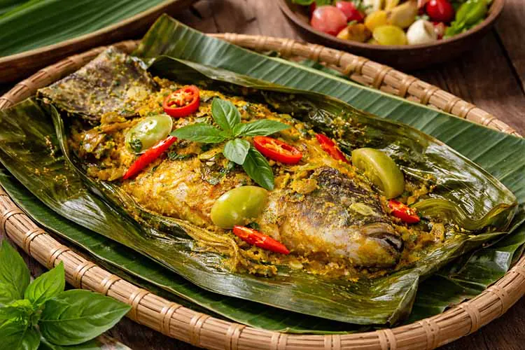 Siapkan dua lapis daun pisang. Letakkan ikan yang sudah berbumbu di atasnya. Tambahkan daun salam dan tumpukan daun kemangi di bagian atas. Bungkus dengan rapi dan semat kedua ujungnya menggunakan lidi. Proses pengukusan dilakukan dalam dandang yang sudah beruap banyak selama kurang lebih 30 menit. Proses ini bertujuan untuk mematangkan daging ikan sekaligus menyatukan rasa rempah.