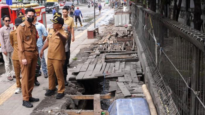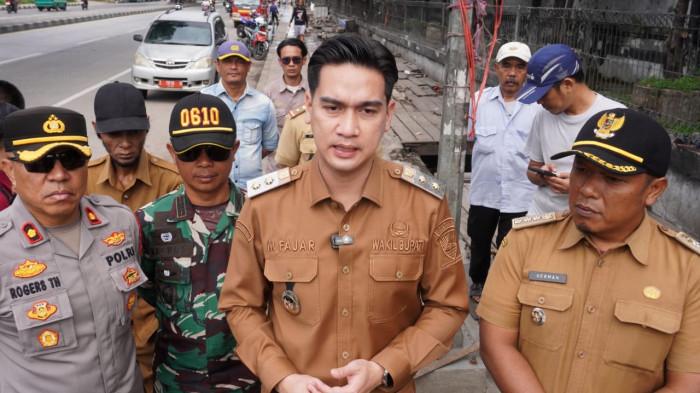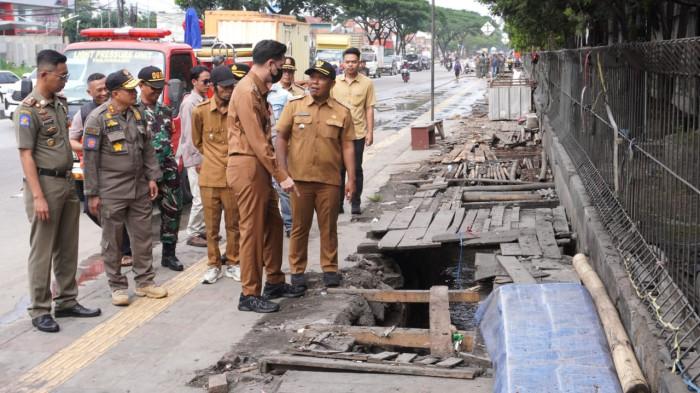 Wakil Bupati Sumedang, M. Fajar Aldila, bersama jajaran pemerintah daerah melakukan pengecekan terhadap trotoar dan saluran air yang telah dibersihkan dari lapak pedagang kaki lima (PKL) di depan Pabrik Kahatex, Jalan Bandung-Garut, Kecamatan Jatinangor, Kabupaten Sumedang, pada Selasa (2/12/2025).
