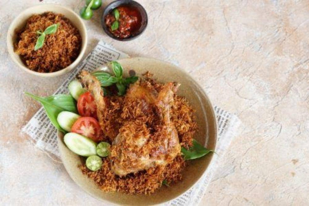 6. Panaskan minyak, goreng daging ayam dan serundengnya sampai matang dan kecokelatan. Angkat dan sajikan.
