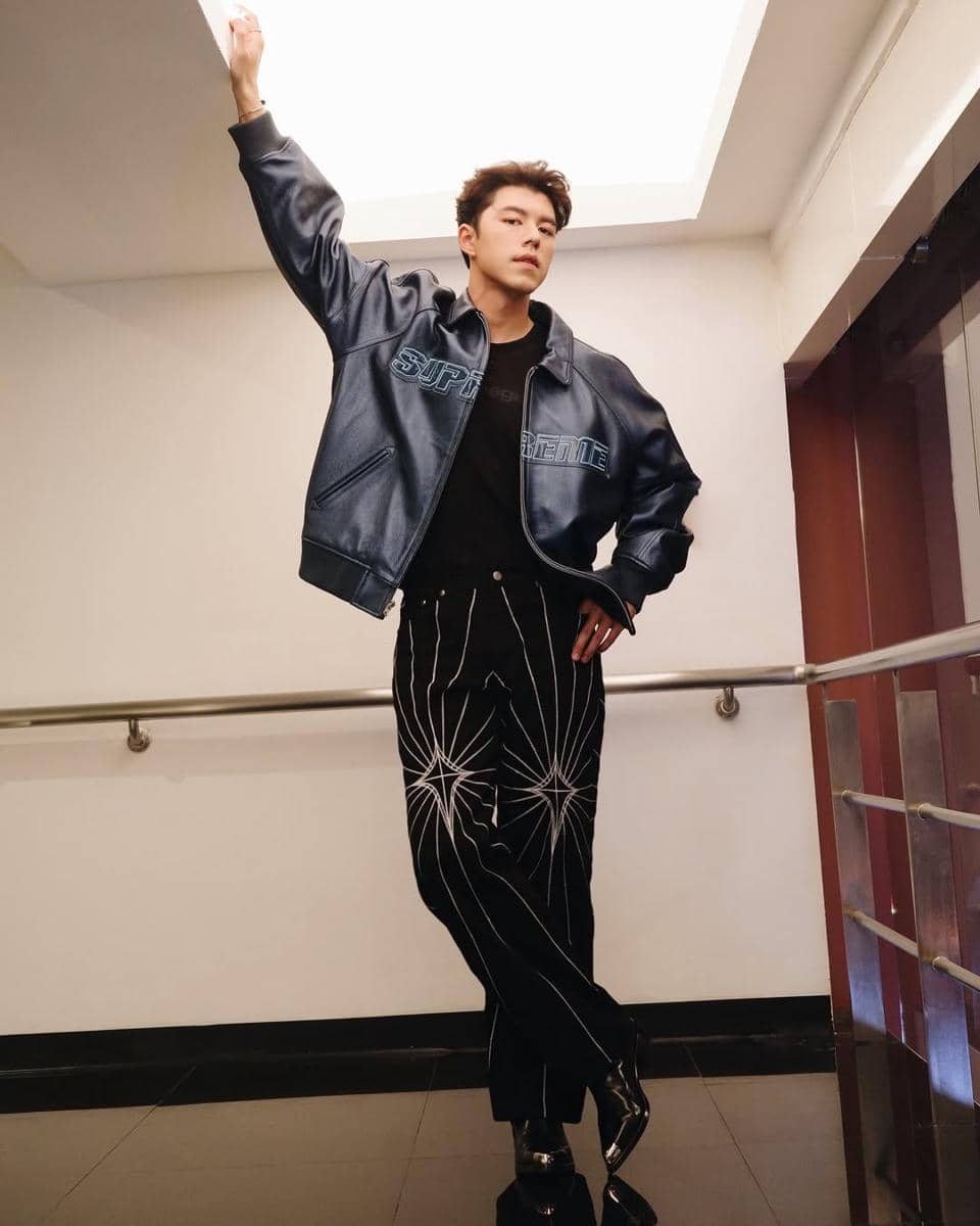 Untuk penampilan yang lebih edgy, Nine memadukan t-shirt yang ditumpuk dengan jaket leather, graphic pants, dan ankle boots. Penampilan ini sempurna untuk acara yang lebih formal atau malam hari.