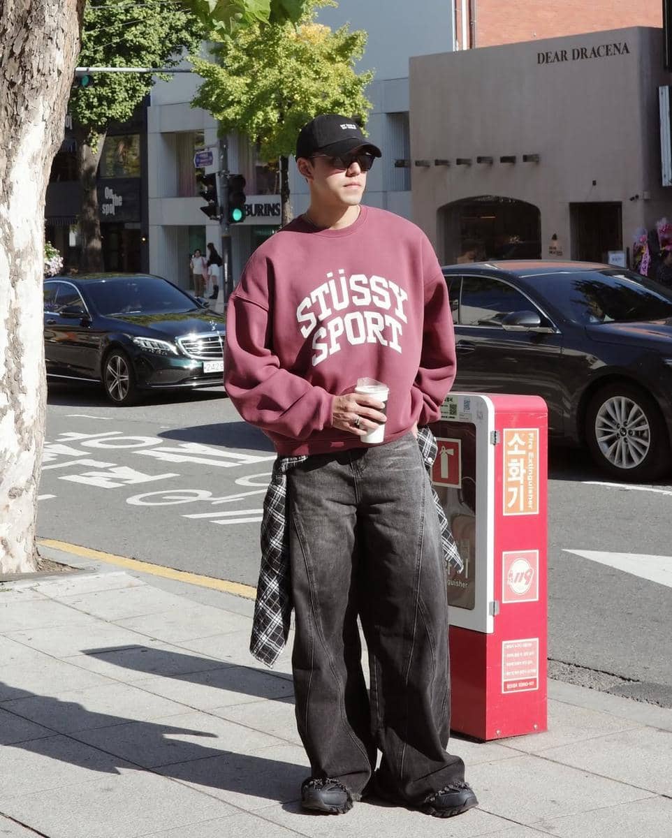 Nine menggunakan barrel jeans yang dilapis dengan ikatan kemeja flanel di pinggang. Selanjutnya, ia memadukannya dengan sweatshirt, sneakers, dan baseball cap. Gaya ini cocok untuk tampil kasual namun tetap elegan.